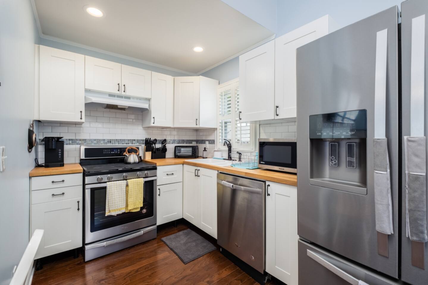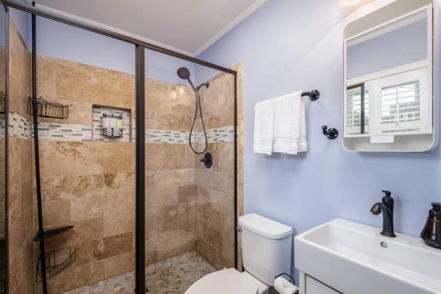 This one large room studio is located above a detached garage. One flight up from deck stairs leads to the patio and entrance. The studio is comfortable for two with one queen sized bed. In a pinch, the sofa can convert to a queen sized bed as well. A maximum of 4 (2 people per bed) would be doable but tight space-wise with little privacy. Home cooked meals may be prepared in the well-stocked kitchenette and table extensions raised for dining. A wall mounted television is provided for entertainment. Note: Driveway and carport limit vehicles to 7’3”H x 7’3”W. Parking is in backyard. There is no parking on street.