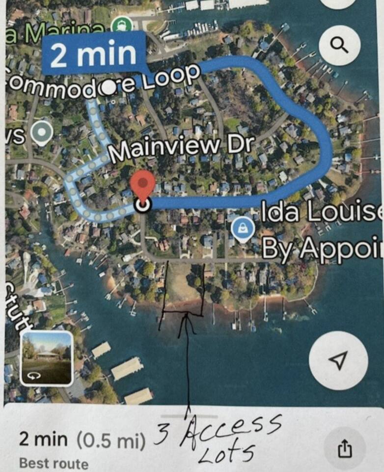 There is an aerial photo with route to the lake access lot from the house included in this listing. There is also a framed detailed color aerial photo on the wall in the house. The long driveway will accommodate 4 vehicles. Your own boat may also be parked on the property.