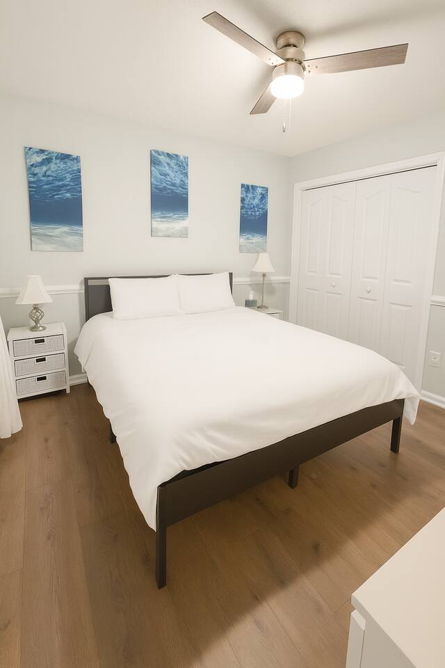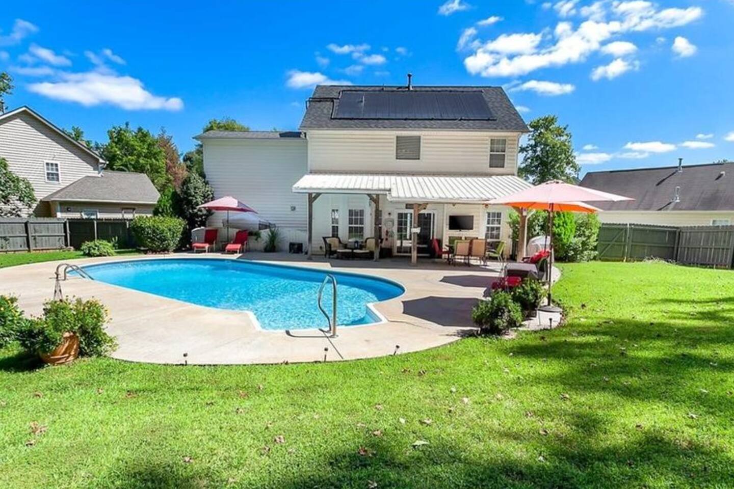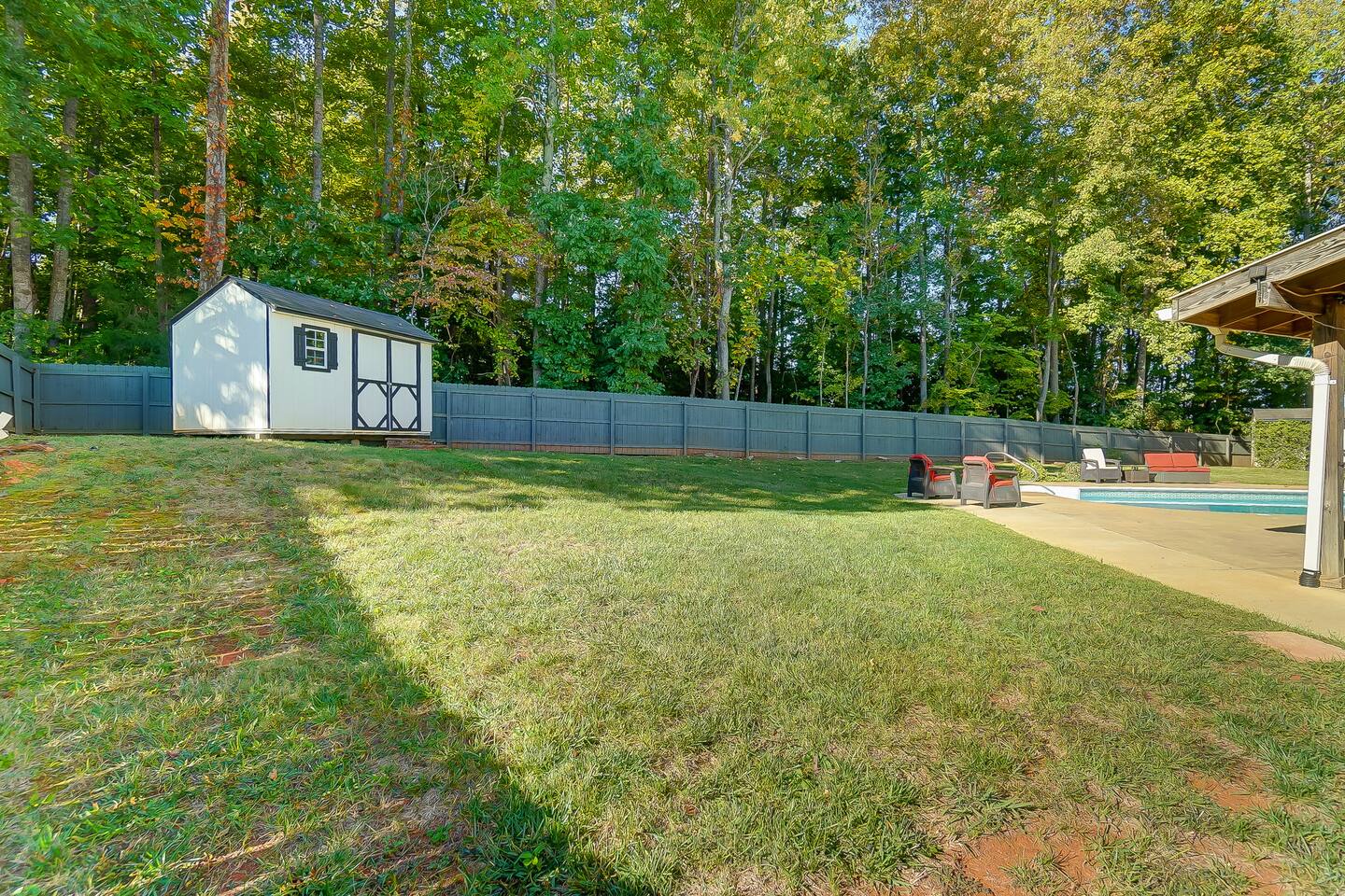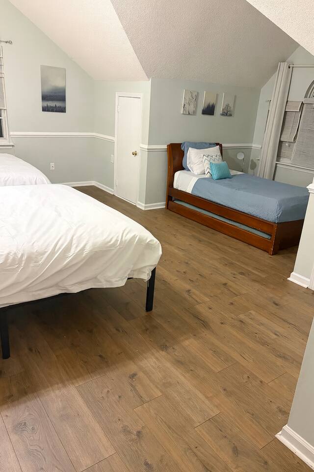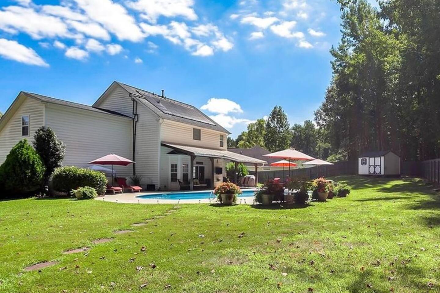 Guests have full access to the entire home and backyard, including the pool (seasonal), patio, and fenced yard except for two locked owners closets (one in the kitchen, one in the upstairs hallway), the garage, and the backyard shed. We have to store stuff somewhere! The driveway accommodates up to 4 vehicles — all parking must be in the driveway (no street parking per neighborhood rules). You’ll enjoy easy self check-in with a keypad code and complete privacy during your stay. (Weekly pool and yard service may stop by to maintain the property — they’ll only access the backyard, never the interior.)