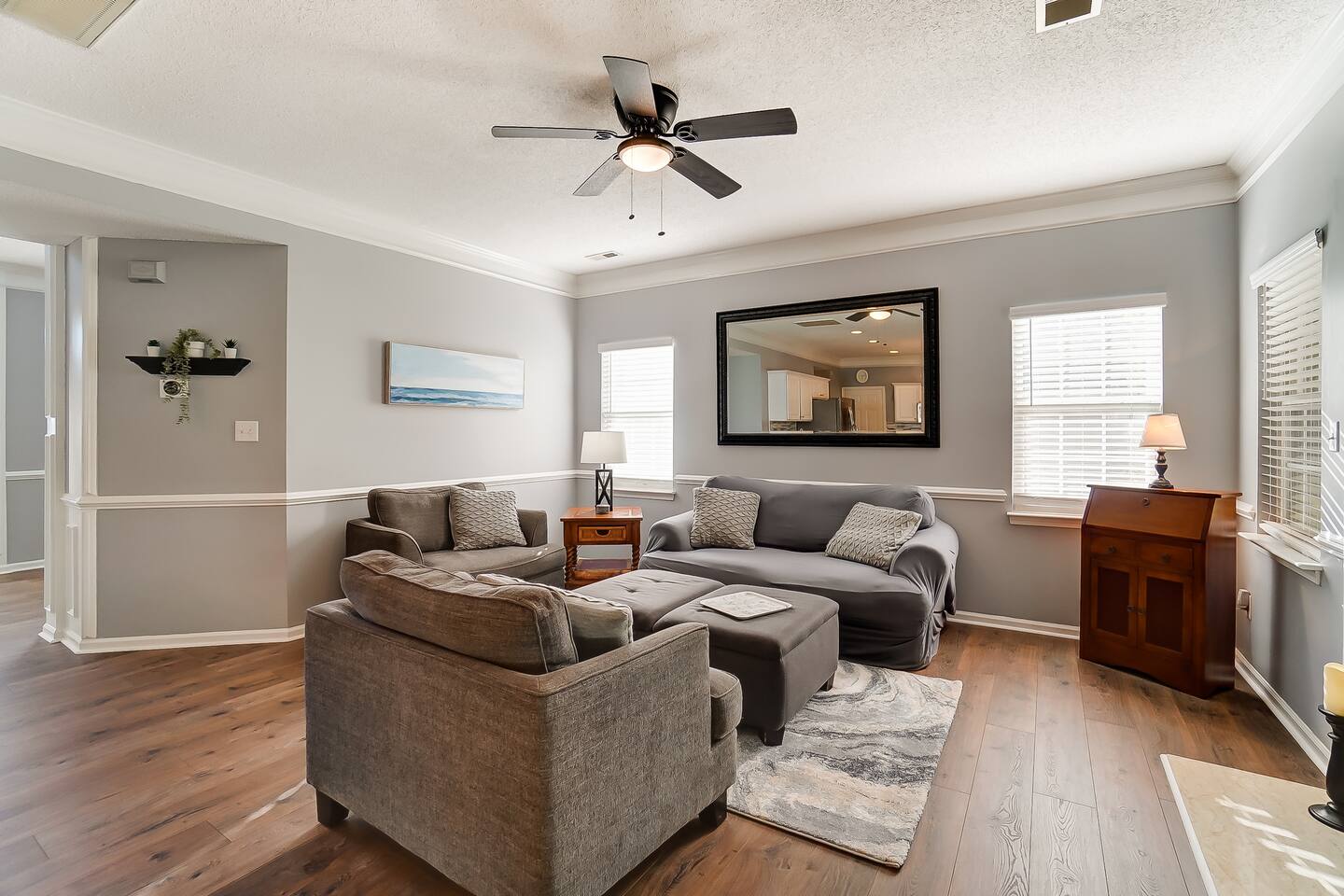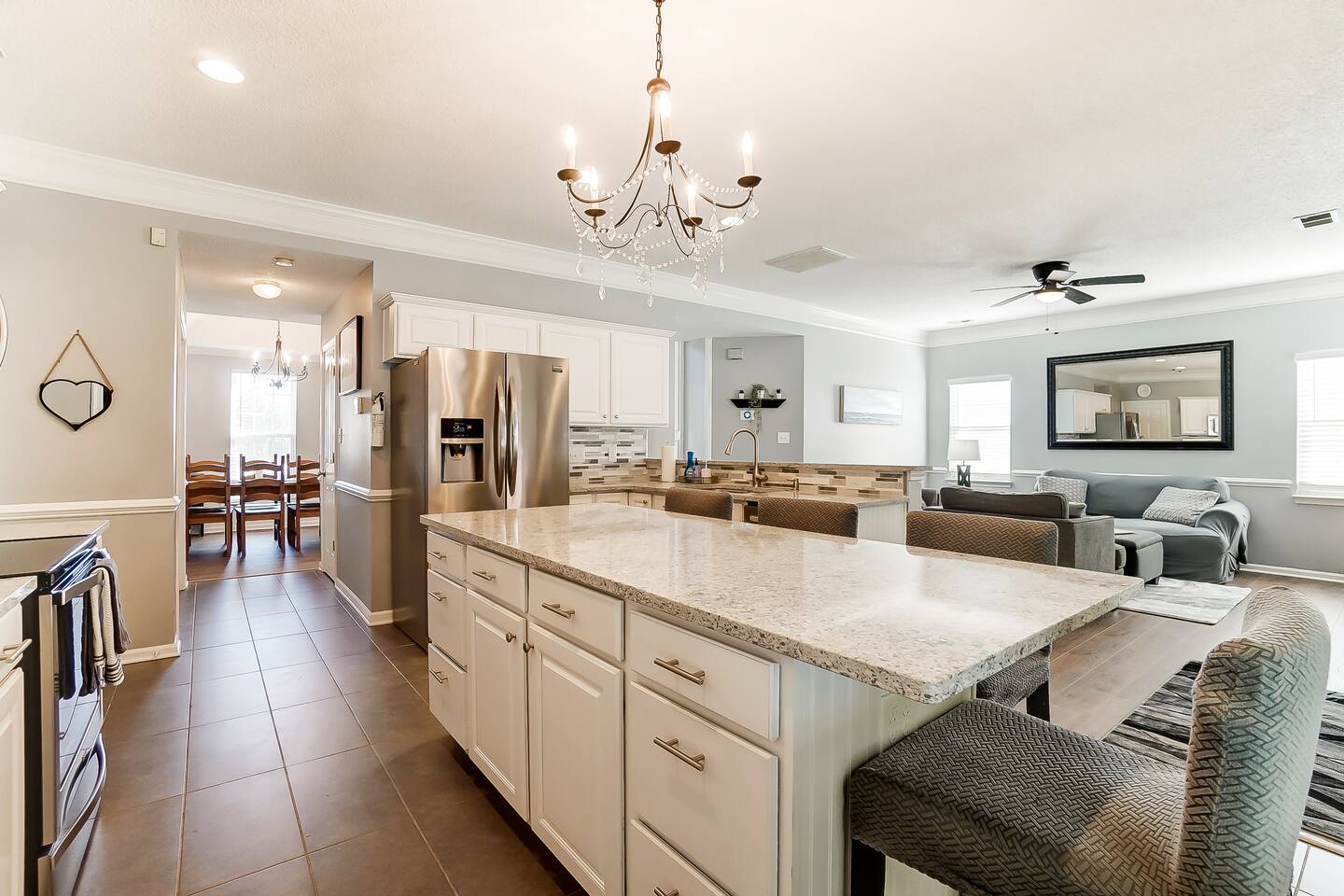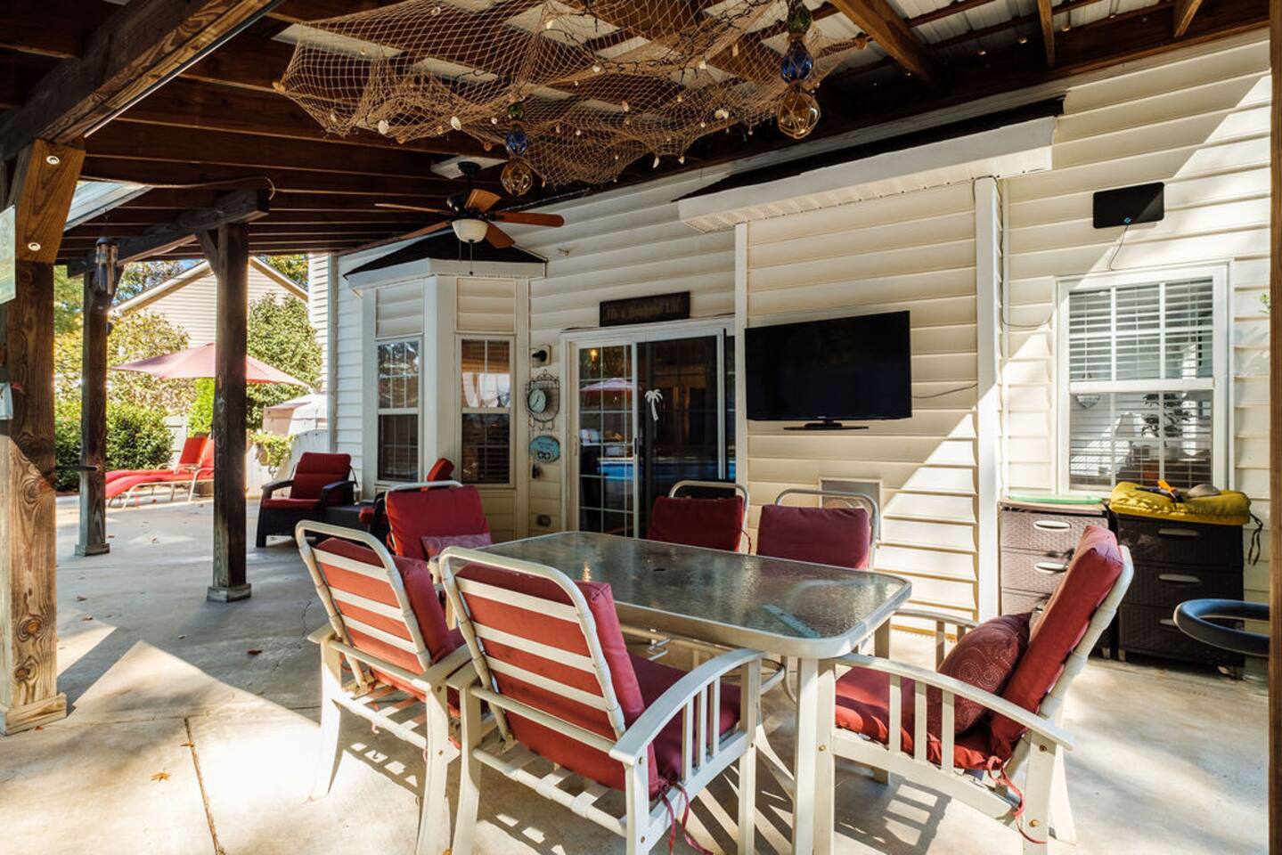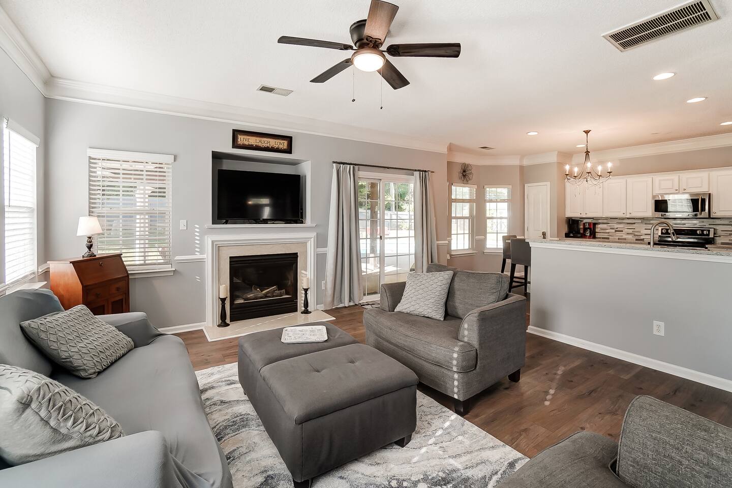 Guests have full access to the entire home and backyard, including the pool (seasonal), patio, and fenced yard except for two locked owners closets (one in the kitchen, one in the upstairs hallway), the garage, and the backyard shed. We have to store stuff somewhere! The driveway accommodates up to 4 vehicles — all parking must be in the driveway (no street parking per neighborhood rules). You’ll enjoy easy self check-in with a keypad code and complete privacy during your stay. (Weekly pool and yard service may stop by to maintain the property — they’ll only access the backyard, never the interior.)