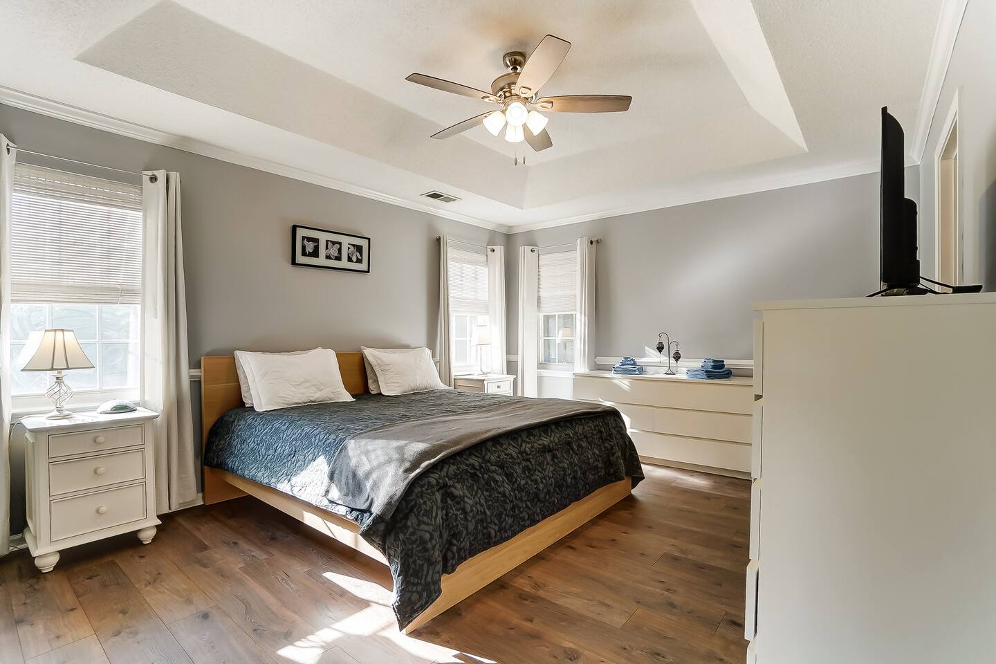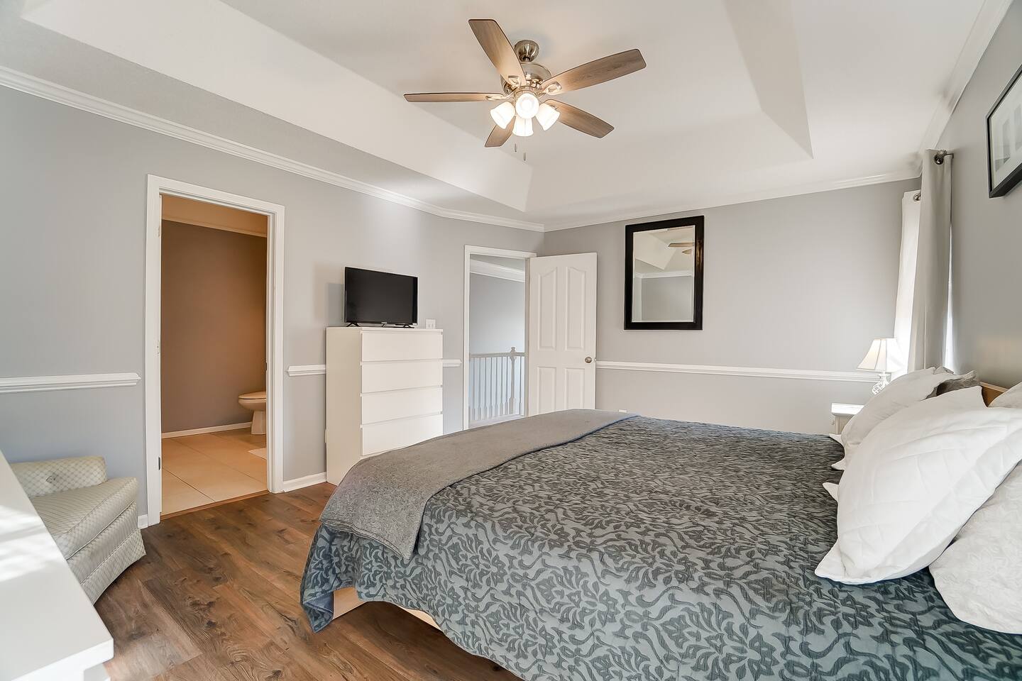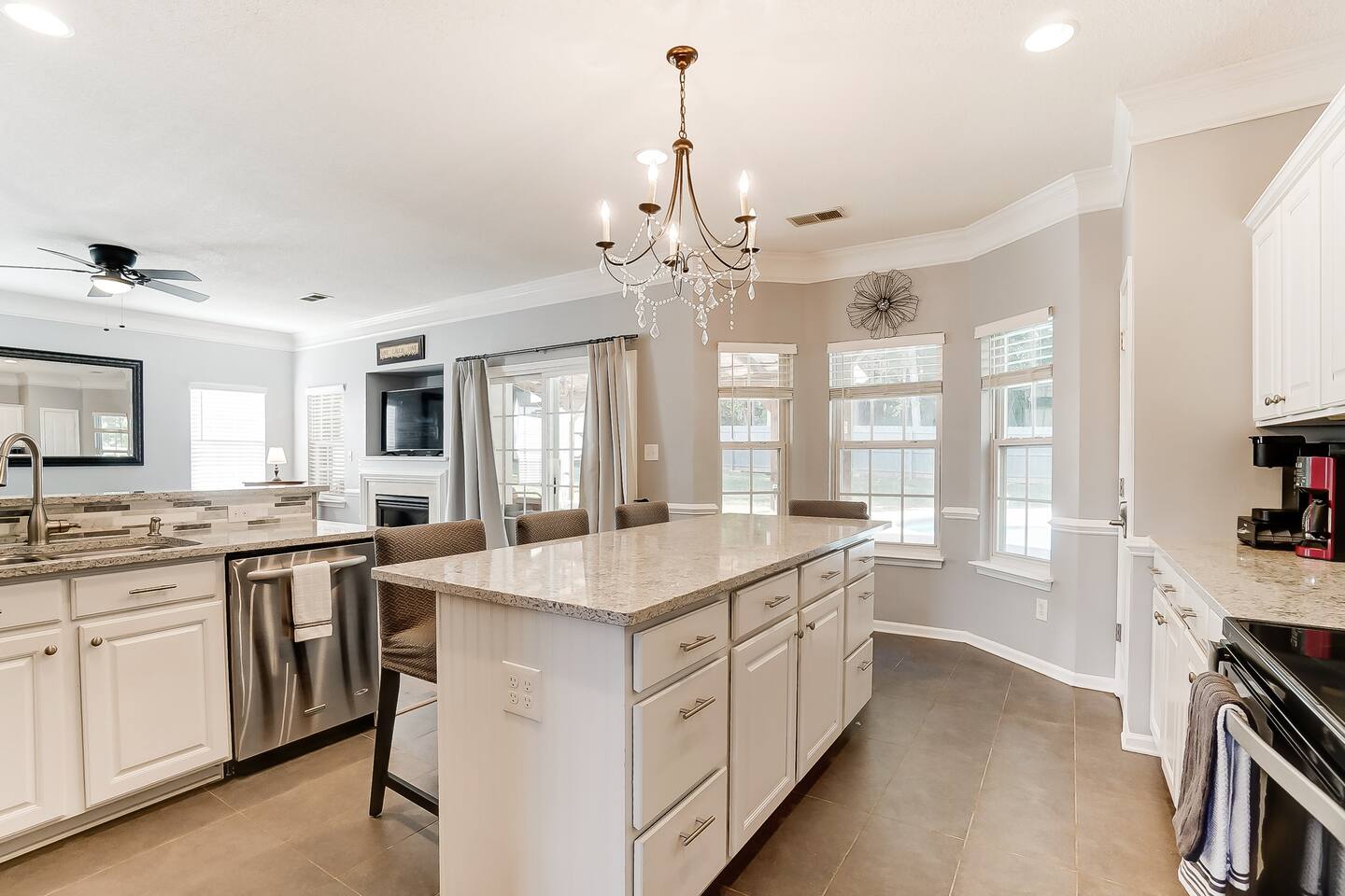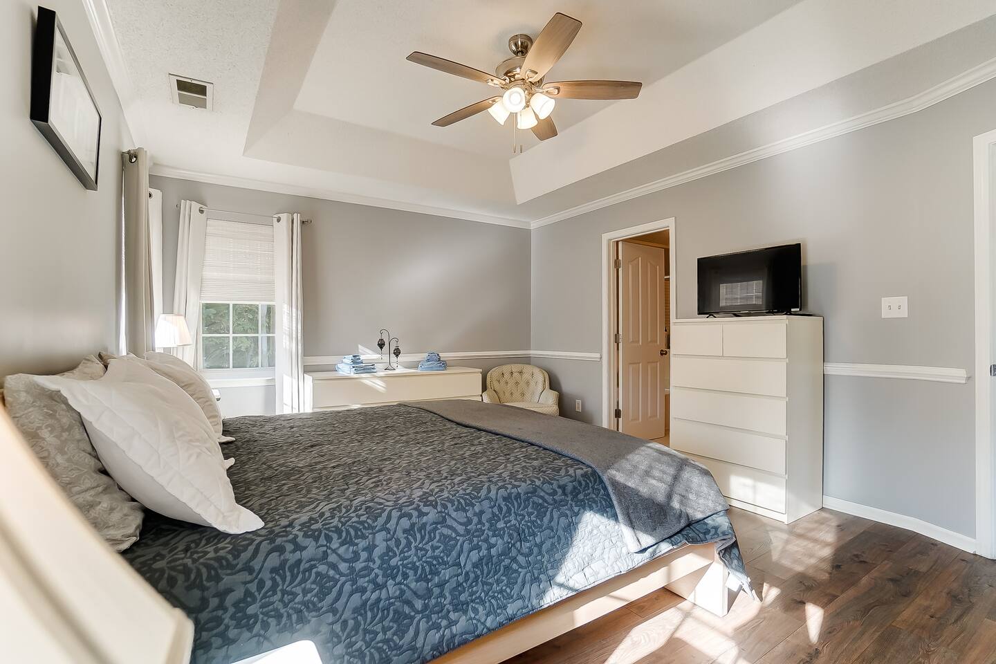 Guests have full access to the entire home and backyard, including the pool (seasonal), patio, and fenced yard except for two locked owners closets (one in the kitchen, one in the upstairs hallway), the garage, and the backyard shed. We have to store stuff somewhere! The driveway accommodates up to 4 vehicles — all parking must be in the driveway (no street parking per neighborhood rules). You’ll enjoy easy self check-in with a keypad code and complete privacy during your stay. (Weekly pool and yard service may stop by to maintain the property — they’ll only access the backyard, never the interior.)