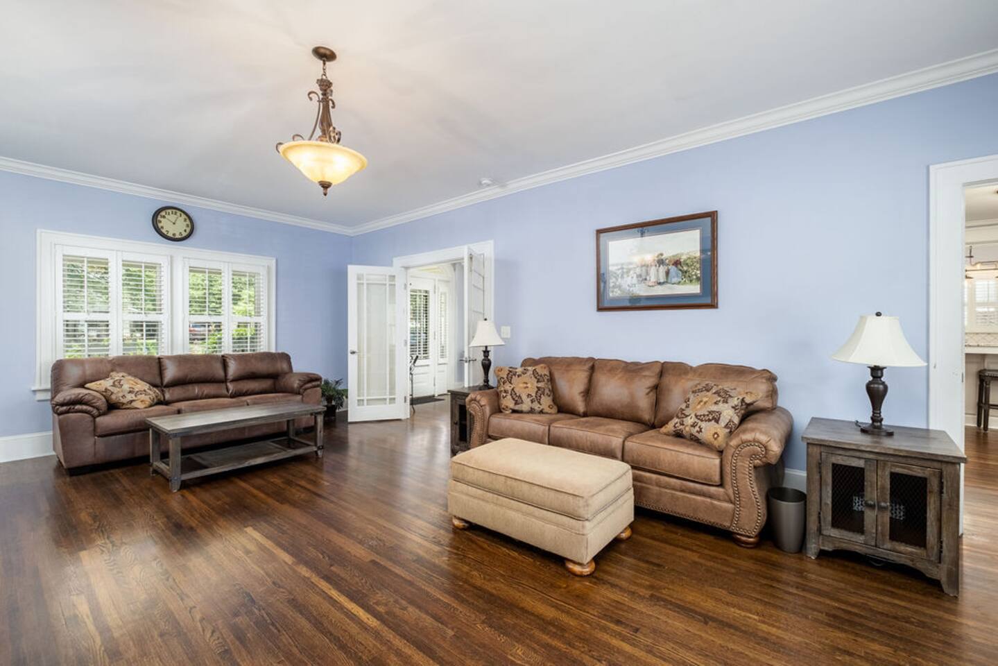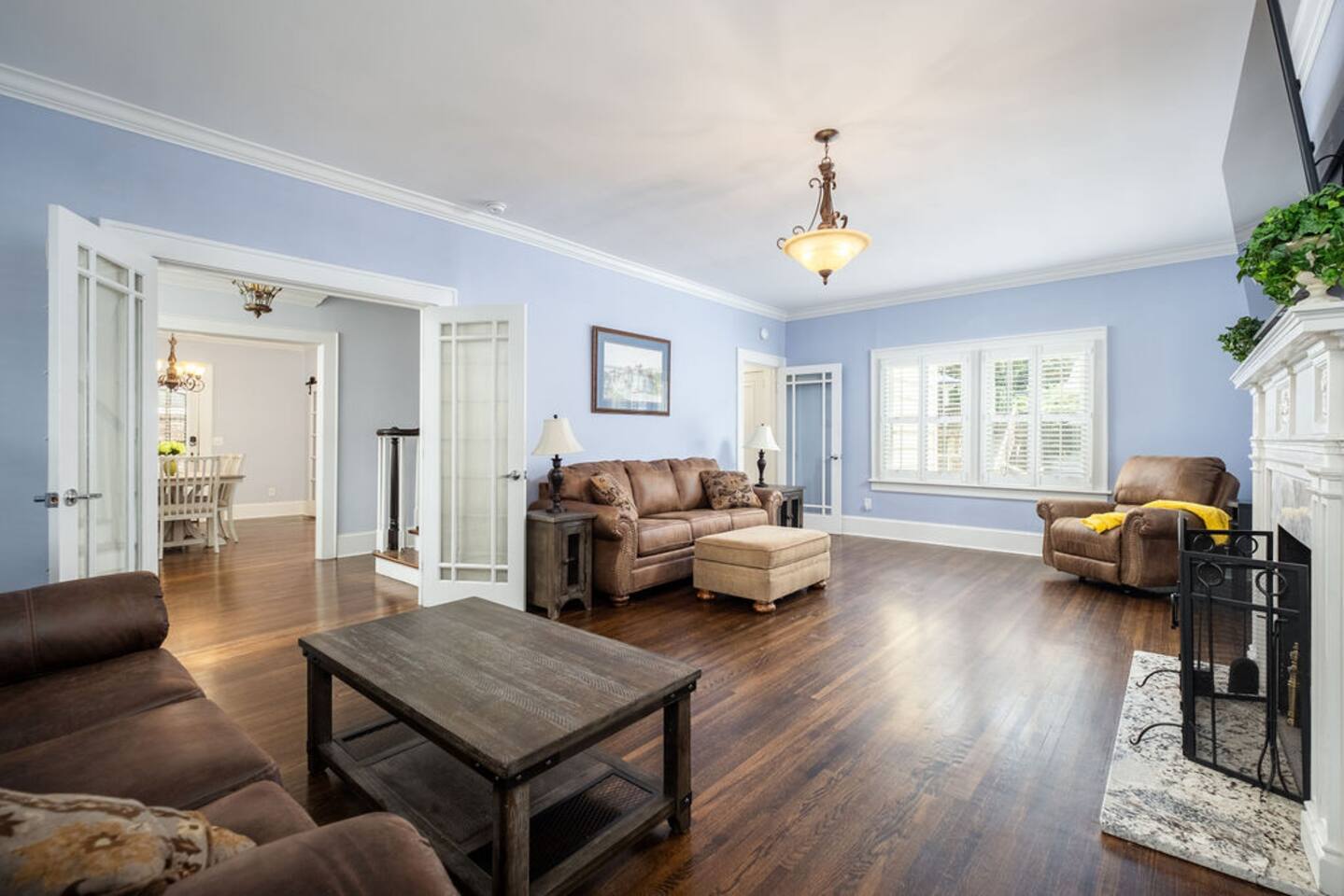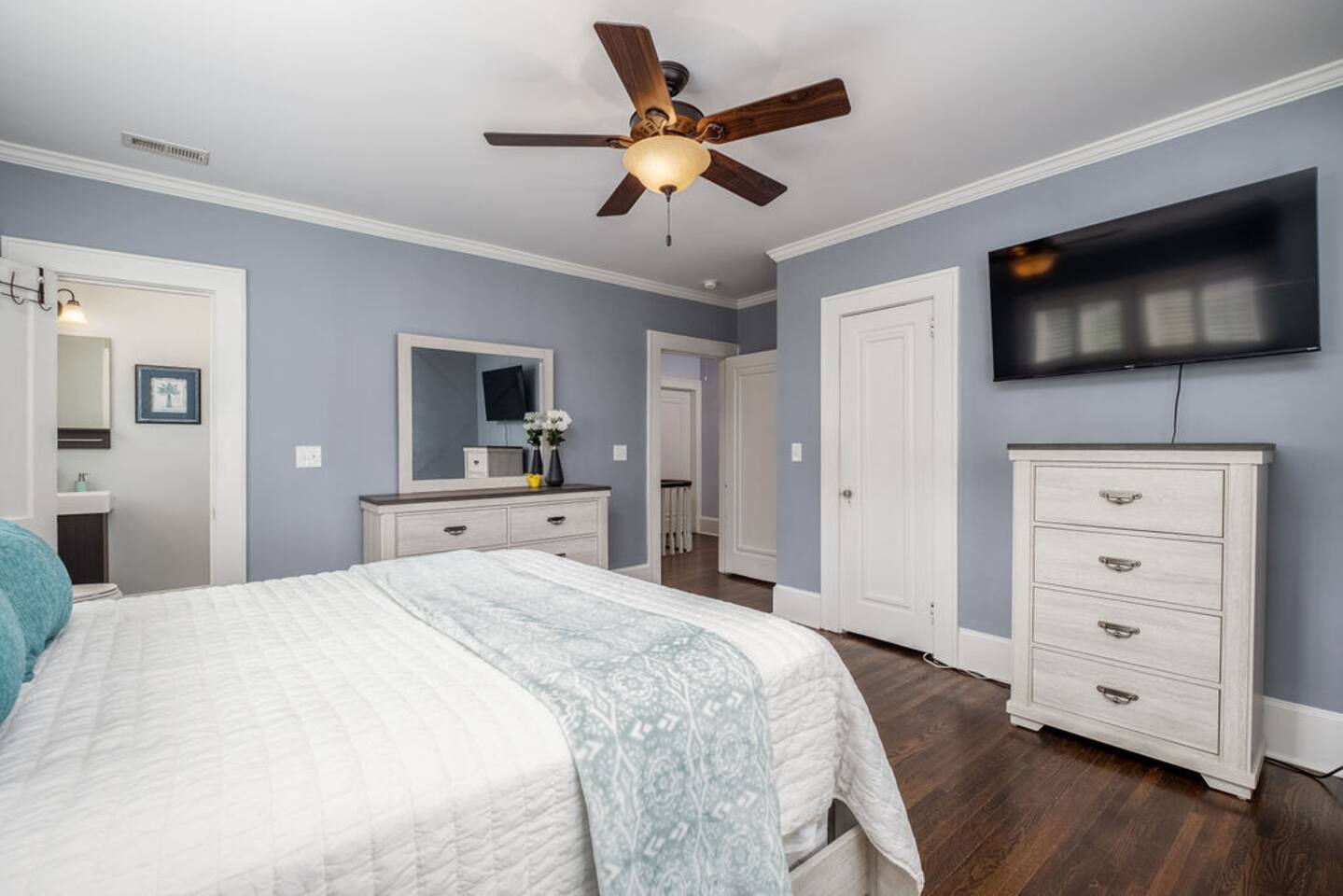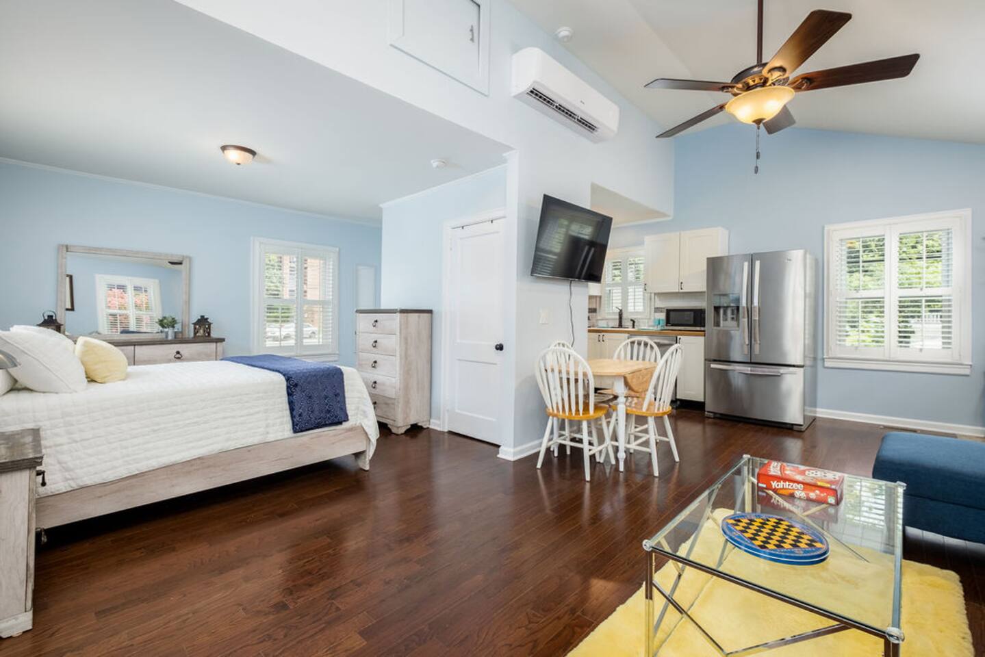 The property includes a main house and a studio apartment (2nd floor of a detached garage) which are both available separately in listings. >>Main house: 3 dreamy bedrooms on the 2nd floor with a queen sized bed and wall mounted television in each. 3 full bathrooms on the 2nd floor and one on the main floor. Rest in comfort in the 1st floor living room, spacious enough for 2 sofas with queen sized pull-out beds and a wall mounted television. Home cooked meals can be prepared in the well-stocked kitchen and served in the dining room (8 seat capacity). A bonus room sports a convertible pool table for billiards, ping pong or dining. Washer and dryer are available for use in the laundry room. Relax on the patio in the backyard. Eye traffic from front porch rockers. >>Studio Apartment (2nd floor of detached garage): Deck stairs lead to 2nd floor patio and entrance to studio. Chic studio has a queen bed, full bathroom, convertible sofa/bed (queen), wall mounted television, dining table (max 4) and well-stocked kitchenette. This apartment is most comfortable for 1-2 people but can be crowded with maximum of 4 in a pinch. *Note: Carport and driveway limit vehicles to max of 7’3” L x 7’3”W. Parking is in backyard. No parking on main street in front.